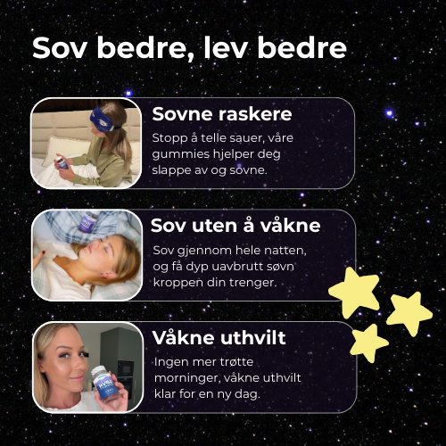 Søvn Gummies er utviklet i Norge med en unik kombinasjon av melatonin og beroligende urter som hjelper deg å sovne raskere, sove dypere og våkne uthvilt – helt uten avhengighet eller bivirkninger.